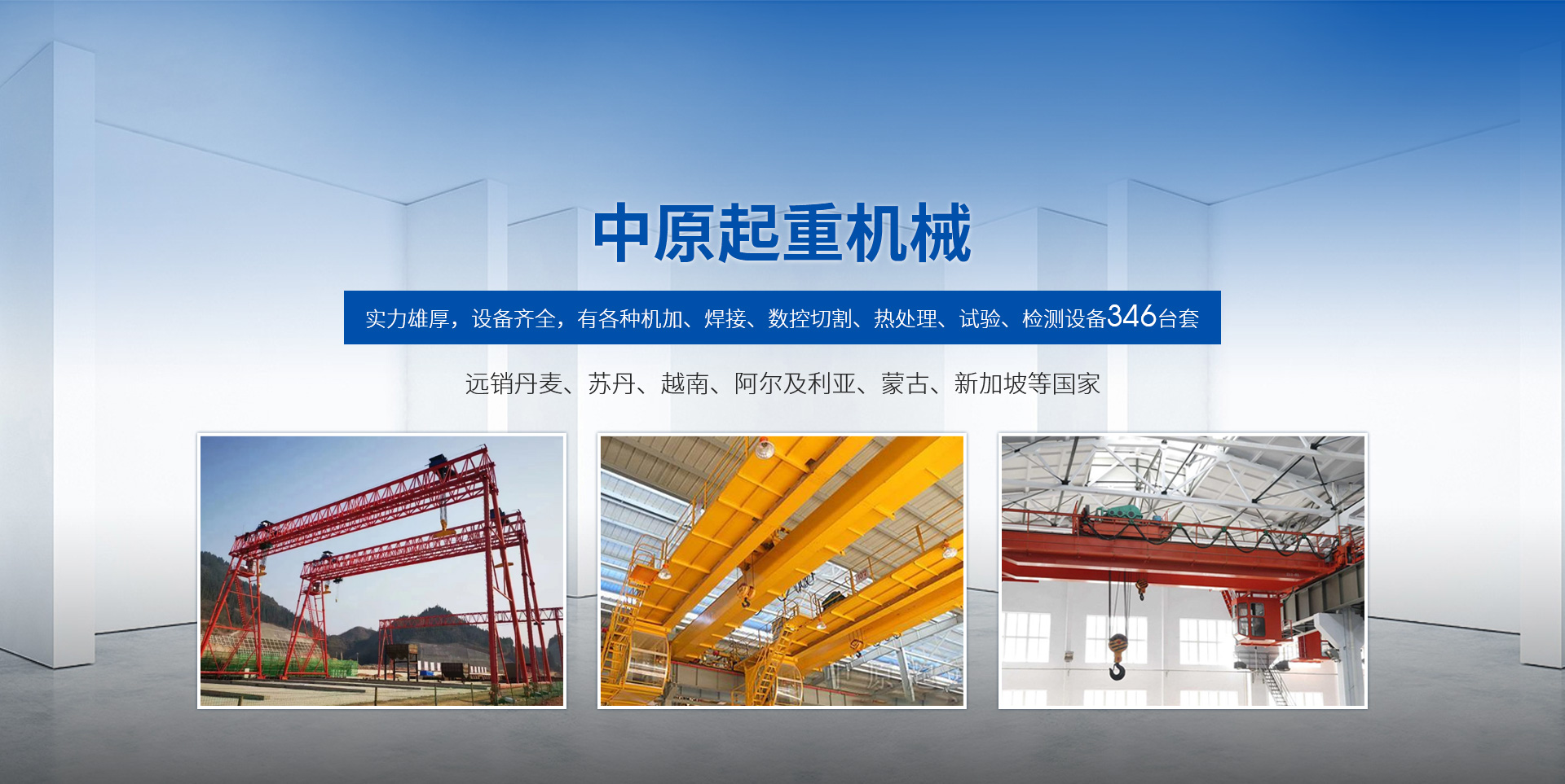 新鄉市中原起重機械有限公司成立于2000年,地處中原,輻射全國28個省市自治區,設外埠經銷處、辦事處268個。產品行銷工礦、建材、化工、冶金、電力、交通、鐵路、油田、港口等各個行業。遠銷丹麥、蘇丹、越南、阿爾及利亞、蒙古、新加坡等國家。  公司實力雄厚,設備齊全,有各種機加、焊接、數控切割、熱處理、試驗、檢測設備7臺;有機加工、熱處理、單、雙梁橋門機生產、檢測、安裝等9個車間,研究中心、運輸公司、安裝維修服務公司等機構,?  主要產品有:LD型1~20噸電動單梁起重機系列產品;5~600噸通用橋式、門式、冶金、上旋轉下旋轉電磁吊、絕緣、抓斗、防爆起重機系列產品;LH3~100噸葫蘆雙梁系列產品;MH5~32噸葫蘆門式系列產品;0.5~40噸CD1、MD1鋼絲繩電葫蘆系列產品;HS1型0.5~20噸手動葫蘆系列產品;0.5~10噸環鏈電動葫蘆系列;0.5~40噸彎道電動葫蘆系列產品;裝卸橋、造船門機、架橋機、鑄造吊和水電大噸位起重機系列產品。  公司建立了強有力的質量保證體系和生產過程的質量控制系統,嚴格執行國家設計、生產標準,有嚴格的生產工藝過程和標準,嚴格的檢驗、檢測標準和手段。